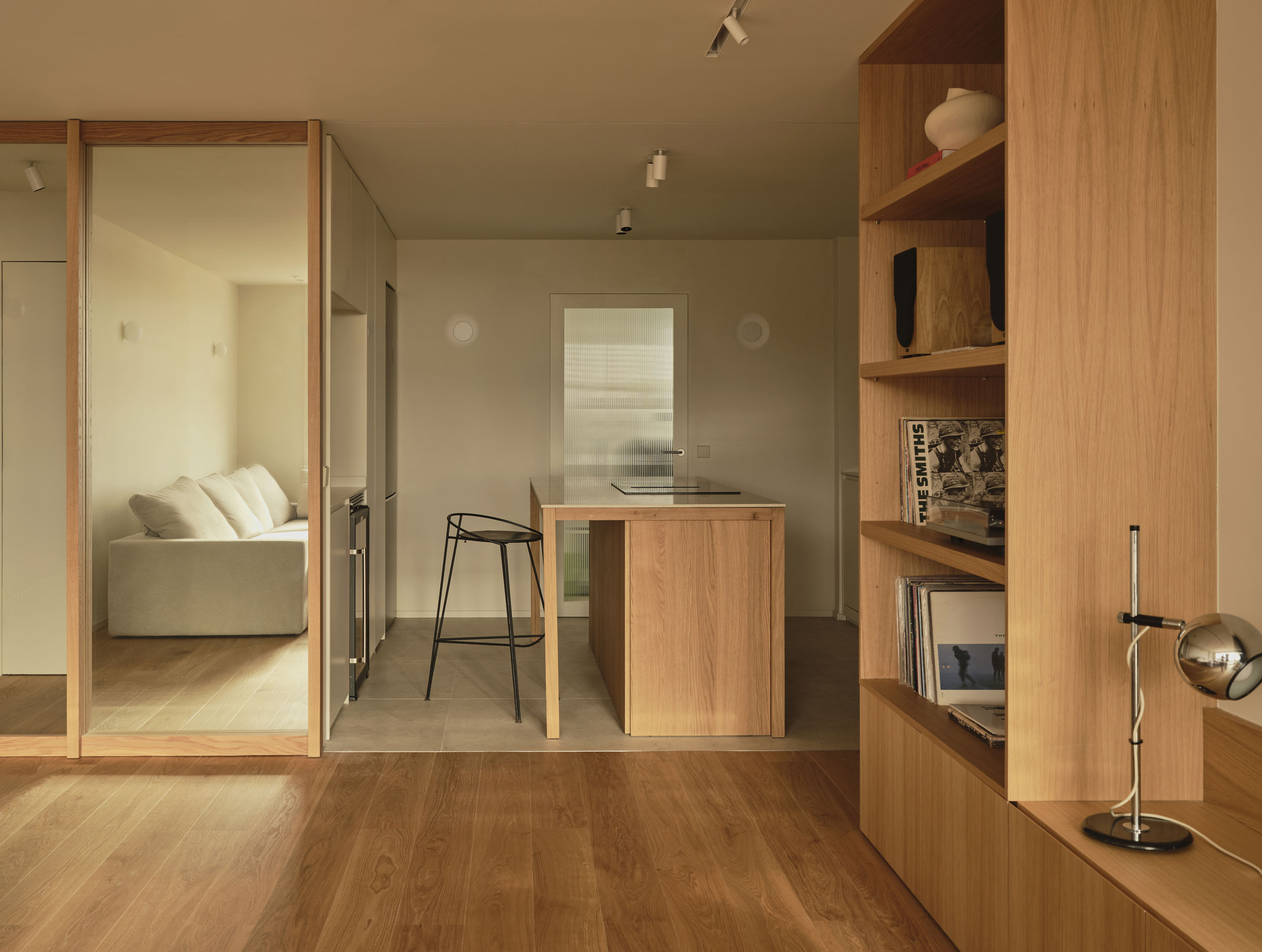 La propuesta se construye a partir de elementos de madera a medida, que funcionan como una envolvente táctil y cálida, aportando vida a una estructura preexistente sin valor arquitectónico. No se trata de revestir cada muro con madera, sino de introducir piezas que visten el espacio, dialogan con él y dotan de sentido al conjunto. De esta forma, el proyecto transforma un contenedor anodino en un hogar con identidad propia.